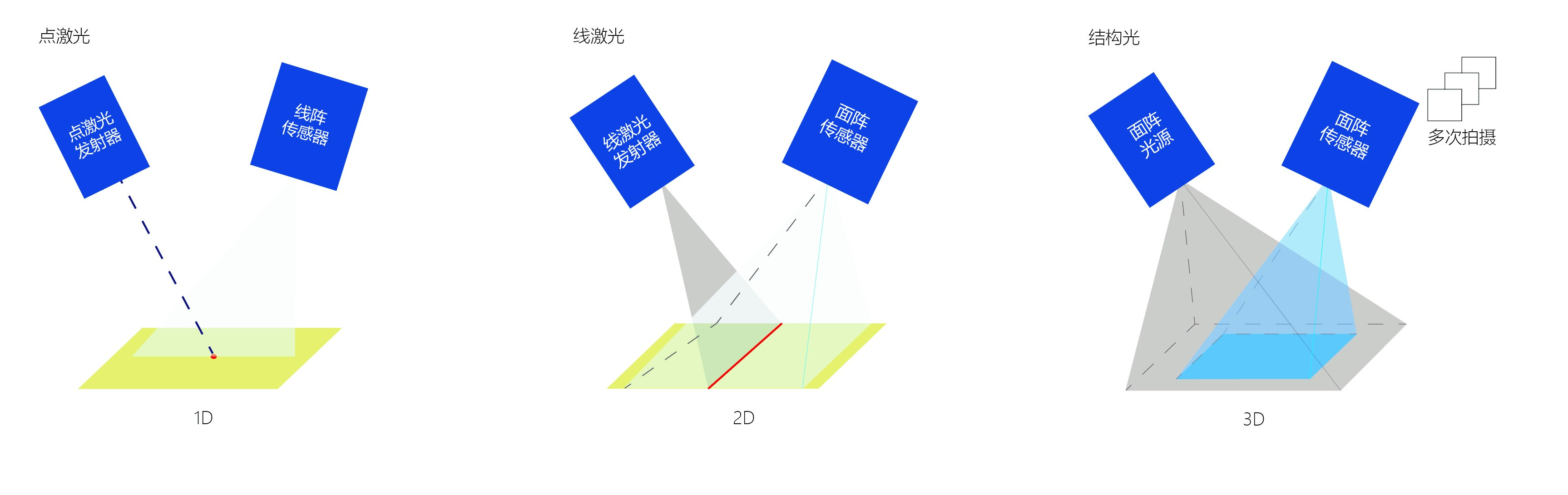 圖1 點激光、線激光與移相法結構光示意圖