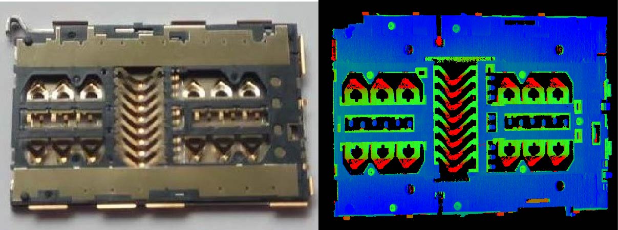 圖2 手機SIM卡座實物與三維拍攝效果對比(同時包含高反光鍍金表面和低反光黑色塑料)