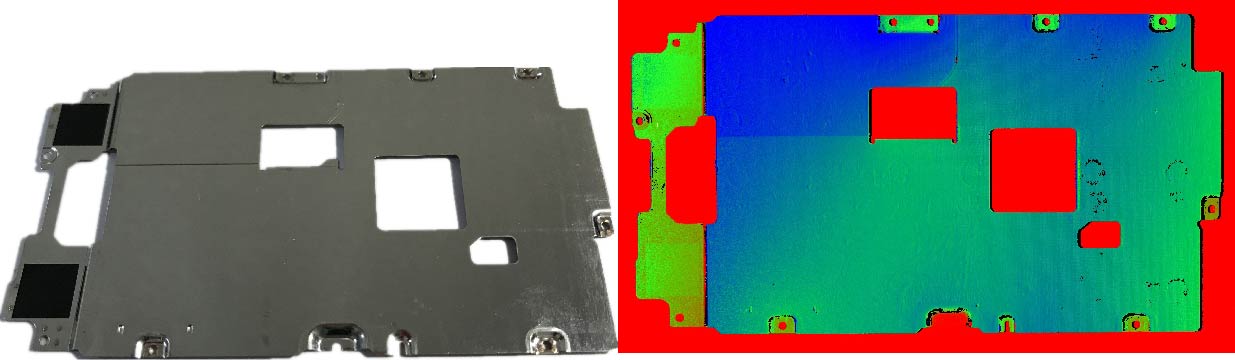 圖3 手機中板實物與三維拍攝效果對比(類鏡面、高反光金屬表面)