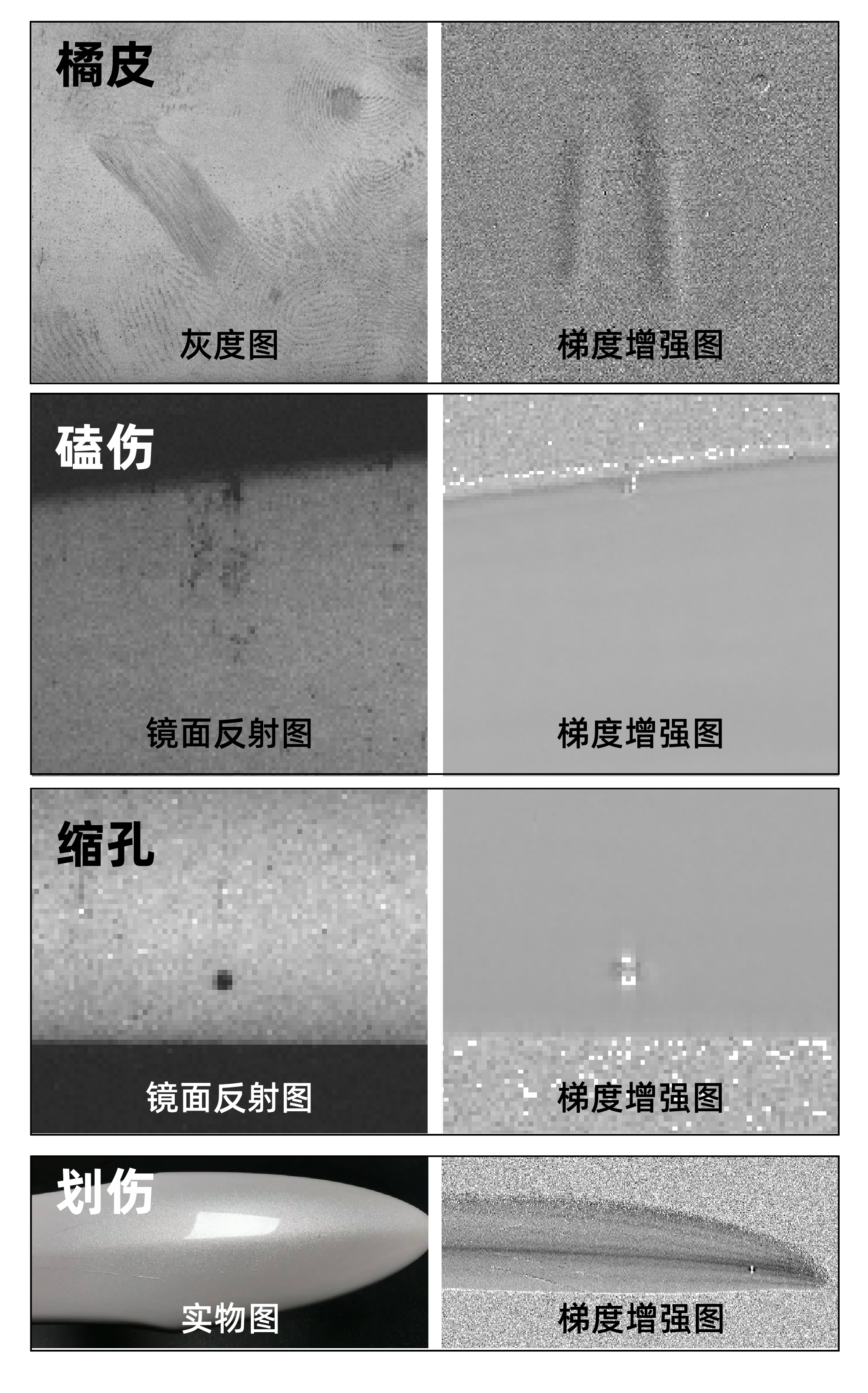 混合數(shù)據(jù)相機(jī)DM ES系列與不同配件靈活搭配,可兼容多種視野、缺陷類(lèi)型的漆面檢測(cè)需求。通過(guò)調(diào)節(jié)條紋圖案的投射方向、圖案樣式或周期等參數(shù),混合數(shù)據(jù)相機(jī)可一次性捕捉漆面表面的橘皮、磕碰傷、縮孔、顆粒等缺陷及瑕疵。